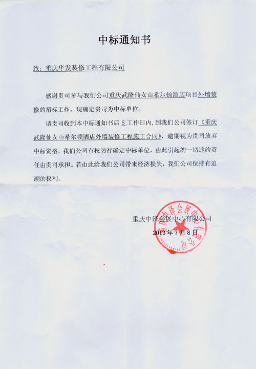 2013年7月8日,我司經(jīng)過數(shù)輪投標(biāo)、談判,在眾多裝修公司中脫穎而出,成功中標(biāo)重慶武隆仙女山希爾頓酒店外墻裝修工程。