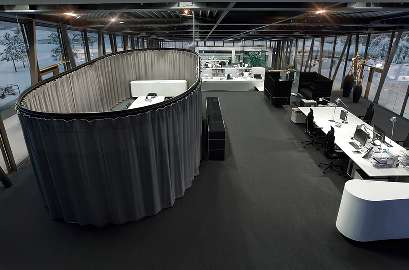 內(nèi)部概念輕松地允許創(chuàng)造新的工作世界。因此,只有在需要的時(shí)候,討論空間才會(huì)出現(xiàn),一個(gè)全方位的幕布會(huì)產(chǎn)生一個(gè)封閉的空間。