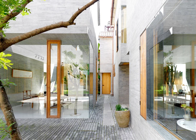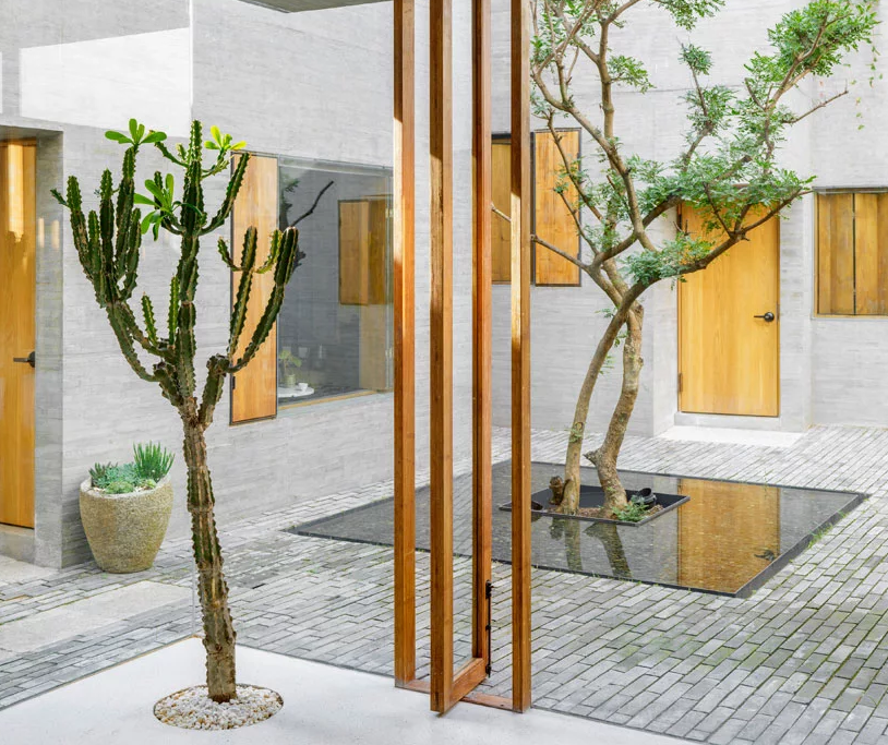 庭院經(jīng)常有一天中某些時(shí)間太暗的缺陷; 然而,sunyata酒店沒(méi)有這個(gè)問(wèn)題。朝陽(yáng)建筑師設(shè)計(jì)了一個(gè)允許光線(xiàn)和視覺(jué)透明度的方案,使庭院成為一個(gè)開(kāi)放的空間,光線(xiàn)投射到各個(gè)角落,陰影和陽(yáng)光混合在一個(gè)舒緩的陰陽(yáng)之中。玻璃飛機(jī)是如此專(zhuān)業(yè)地安裝,即使是人類(lèi)也會(huì)懷疑它們的存在/知道空間的起點(diǎn)和終點(diǎn)。
